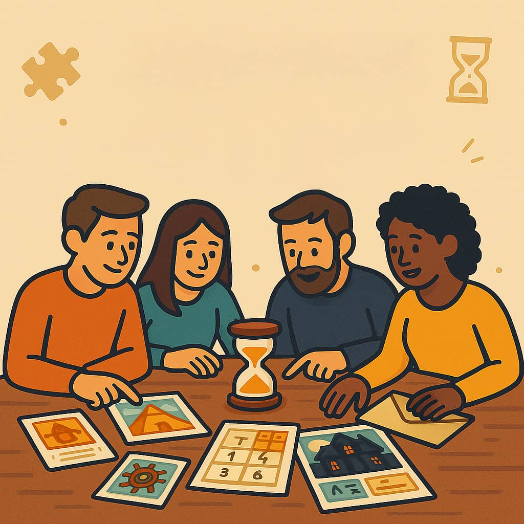 Pure puzzle time is about 60 minutes. Add 15–20 minutes for setup. Using all hints can speed things up; skipping hints makes it a bit longer — great for a full evening.